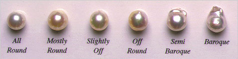 Shape: A quality evaluation category used to describe the shape of a pearl. The most valuable pearls are round. However, other shapes of pearls include off-round, drop, oval, button (one flat side), circled, semi-baroque and baroque (asymmetrical/freeform). Freshwater cultured pearls are grown in all of the aforementioned shapes as well as stick, angel-wing, cross and coin (flat on two sides) shapes.
