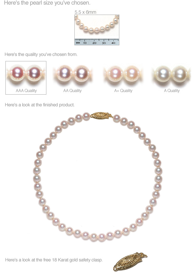 This fine quality pearl strand contains pearls perfectly matched in shape, color and luster. This strand is an AAA quality, the highest grading out of (1) A, (2) A+, (3) AA and (4) AAA. The better the grade, the more luster the pearls have. Luster is the mirror like quality of the pearl. It is the amount of light that reflects off the surface of the pearl. Higher luster pearls do not exist. This neckalce comes standard length at 16 inches long. All the pearls are over 5.5 millimeters and under 6 millimeters. These pearls were farmed in the saltwater oceans off the shores of japan. Extremely cold waters are responsible for the pearls' high luster. This is where the inventor of the cultured pearl made his first round cultured pearl that changed the world. A great sweet sixteen gift or graduation gift, 5.5mm x 6mm sized pearls are ideal for young women aged 12 to 16 years old. This strand is 16 inches long and is strung with silk and a 18K Gold clasp. The quality of this strand can be seen in the chart above under AAA. If you are interested in a a better quality pearl strand with higher luster, you can't find it. If this is the strand for you, please request silver or rosé overtones and order. Otherwise, please visit the links below.