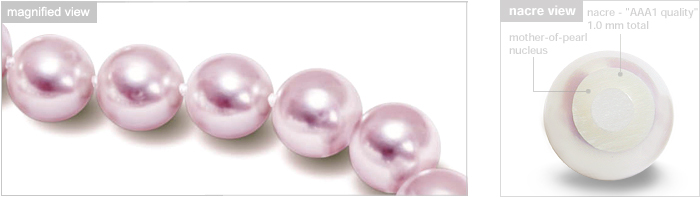 The "AAA1 Quality Pearls" shown in this necklace exhibit very high luster and have very thick nacre (the skin of the pearl). In fact, nacre thickness and luster are directly correlated. In order for a finer quality Japanese Akoya cultured pearl to have very high luster, it must have very thick nacre. According to the Gemological Institute of America, pearls with very high luster (AAA1 Quality) must have at least 1 millimeters of nacre thickness on all of the pearls.