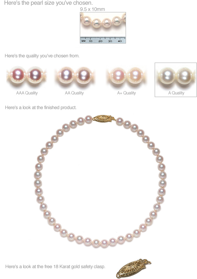 9.5 x 10mm - Generally for older women, 45 years and up or extremely successful 30s. The Lamborghini of pearls. Absolutely majestic, fit for a queen. The rarest size of all, virtually impossible to get -- Japanese cultured pearls simply don't grow any larger than this. A guaranteed grand slam for Mother's Day, Christmas or any event for the elegant elderly woman. Made most famous by Barbara Bush who was often seen with her pearls of this size coiled around her neck. Usually purchased as a double strand (36 inches).