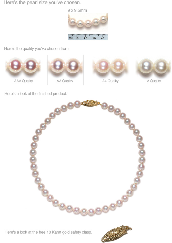 9 x 9.5mm - Generally for older women, 45 years and up or extremely successful 30s. The Ferrari of pearls, and the CEO's strand. Simply regal -- and extremely rare. For a refined, discriminating woman who is serious about her pearls and won't settle for anything but the best. Also a solid choice for an older woman on her way into upper management who now needs to notch it up over her well-worn 7.5 x 8mm strand. The second-rarest size, it makes for a strand that is sure to be very hip and stylish in any social bracket -- her friends won't stop talking about it (you'll socre big points for this!). It is usually purchased as a versatile double-strand choker (18 inches) that can be converted into a single-strand opera (36 inches).