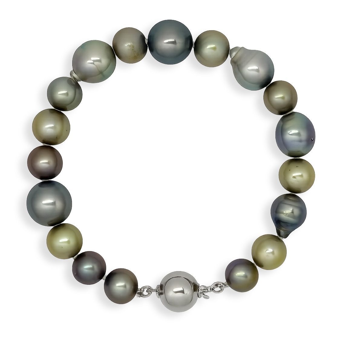 The Forrest Love Pearl Bracelet combines 10mm Tahitian Round Pearls, 9mm Tahitian Baroque Pearls, Color Enhanced Green Freshwater Pearls finished with a Silver Ball Clasp. Each Bracelet is 7 inches.