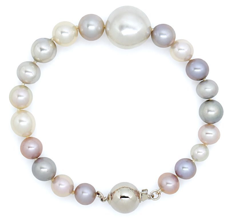 The Glacier Love Pearl Bracelet combines 13mm White South Sea Pearl, 7mm Blue Akoya Pearls, 5mm Lavender Freshwater Pearls and 7mm White Akoya Baroque Pearls finished with a Silver Ball Clasp. Each Bracelet is 7 inches.