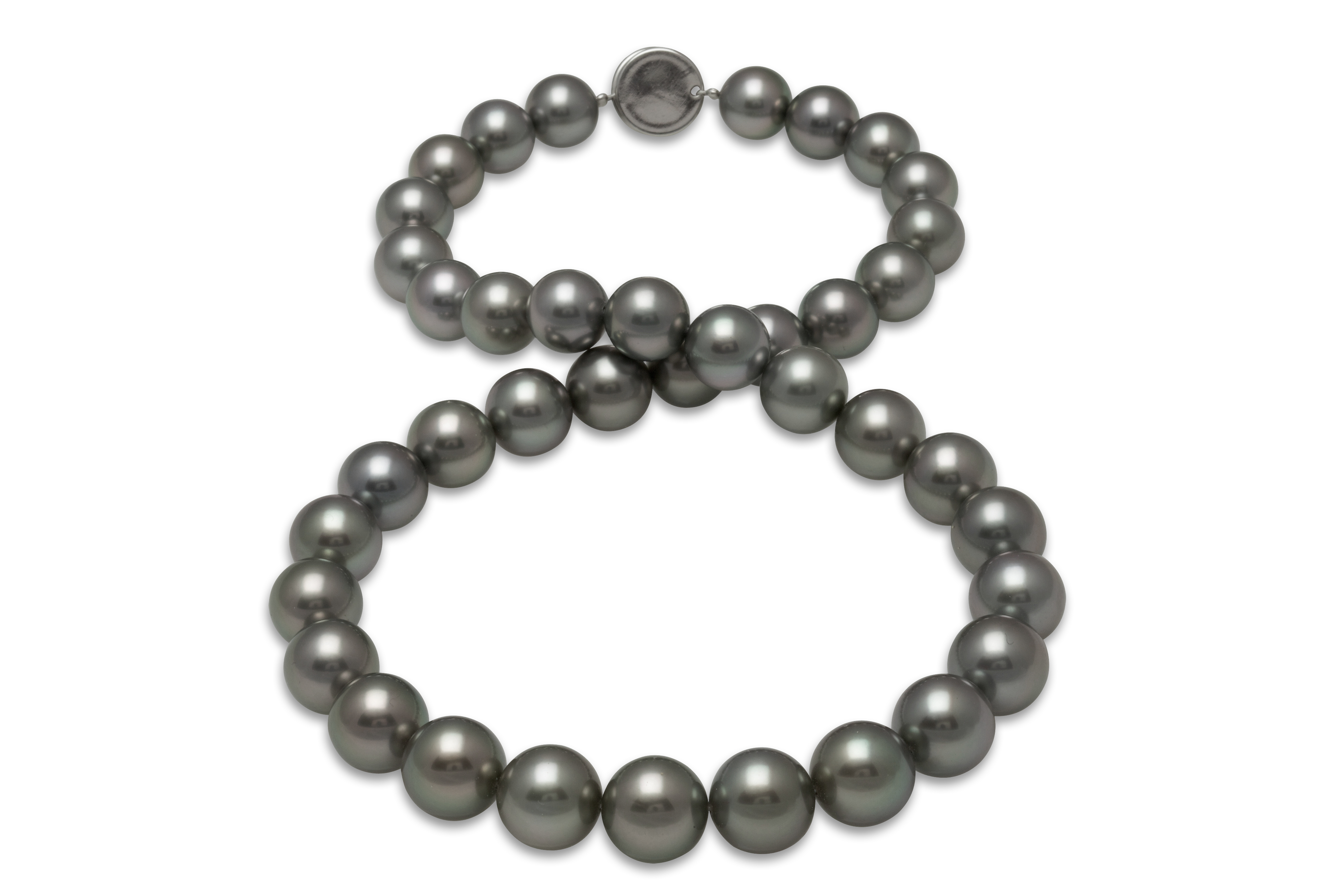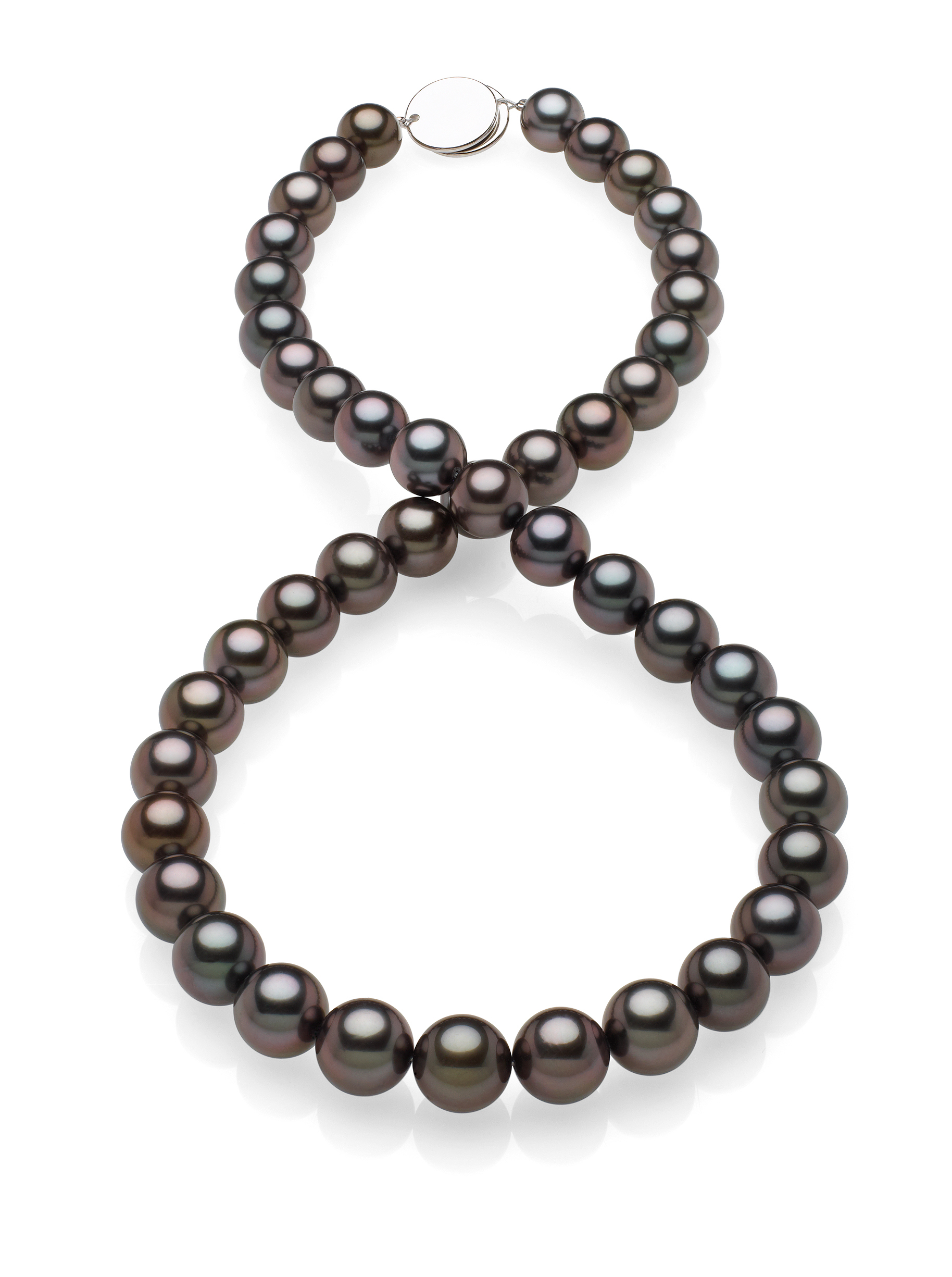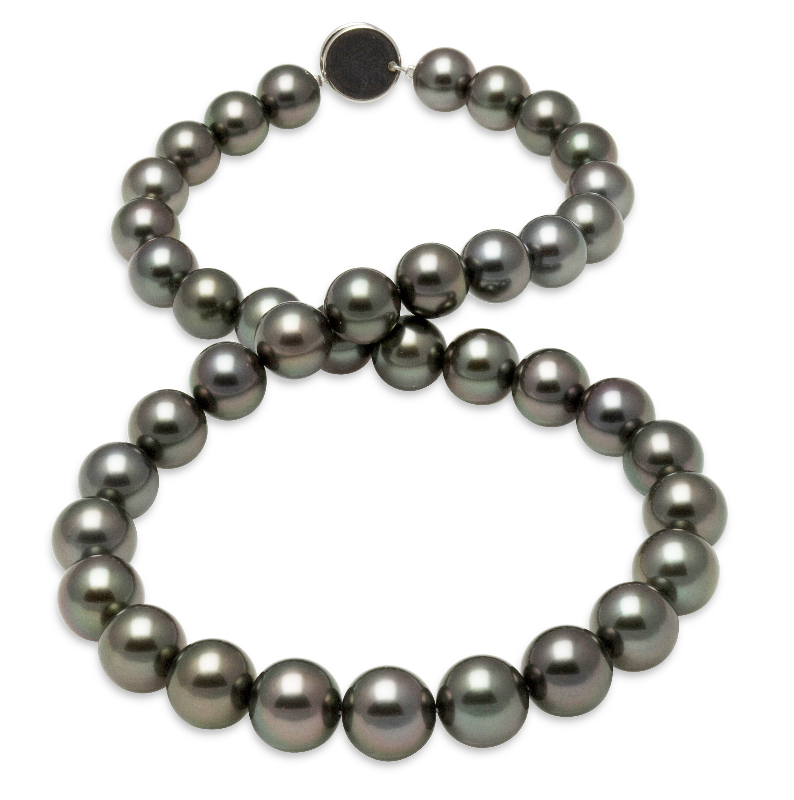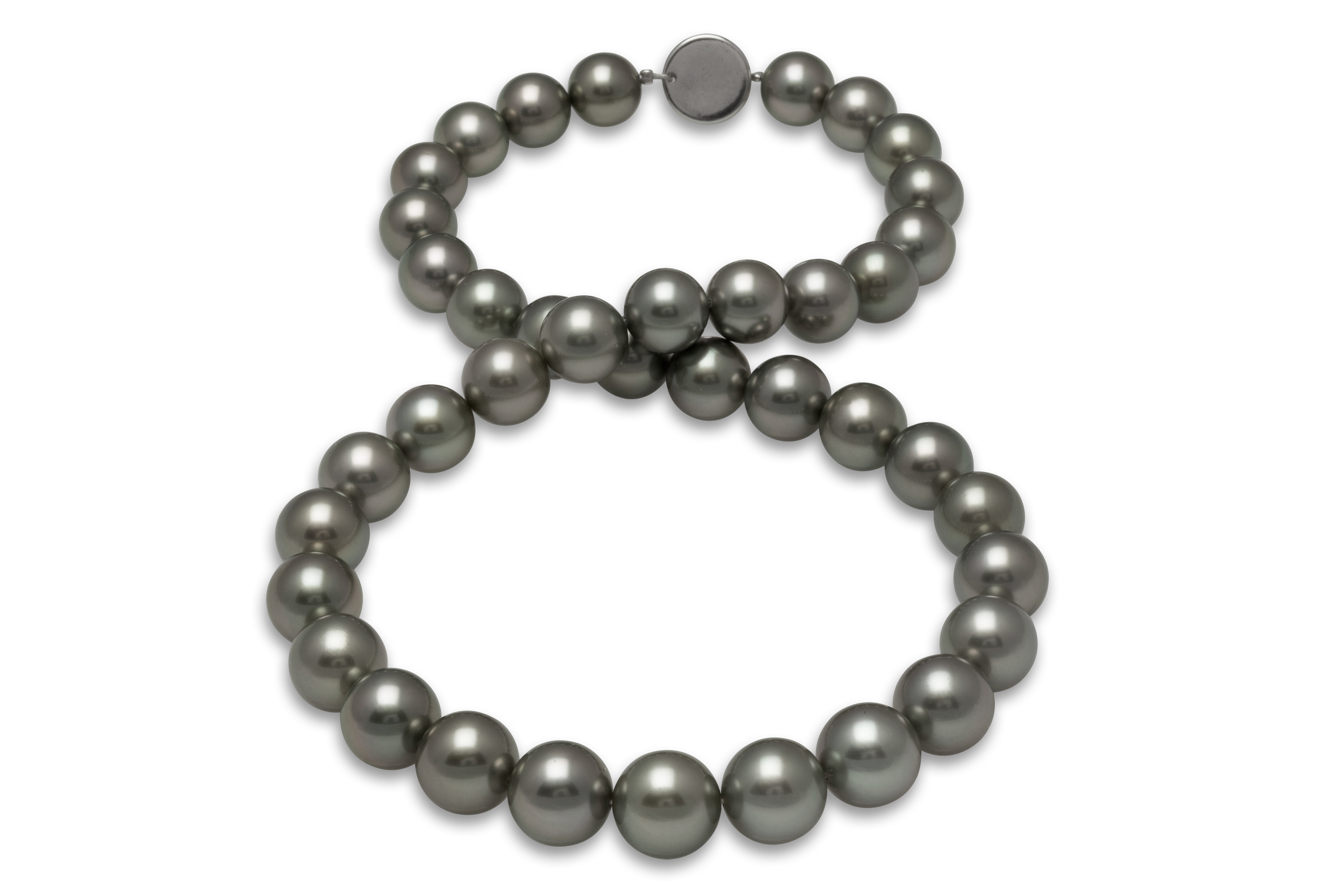 10x12mm Black Tahitian Pearl Necklace This beautiful natural color Tahitian cultured pearl necklace was just harvested from French Polynesia. The perfectly round lustrous pearls on this necklace were expertly matched by American Pearl's GIA trained staff.