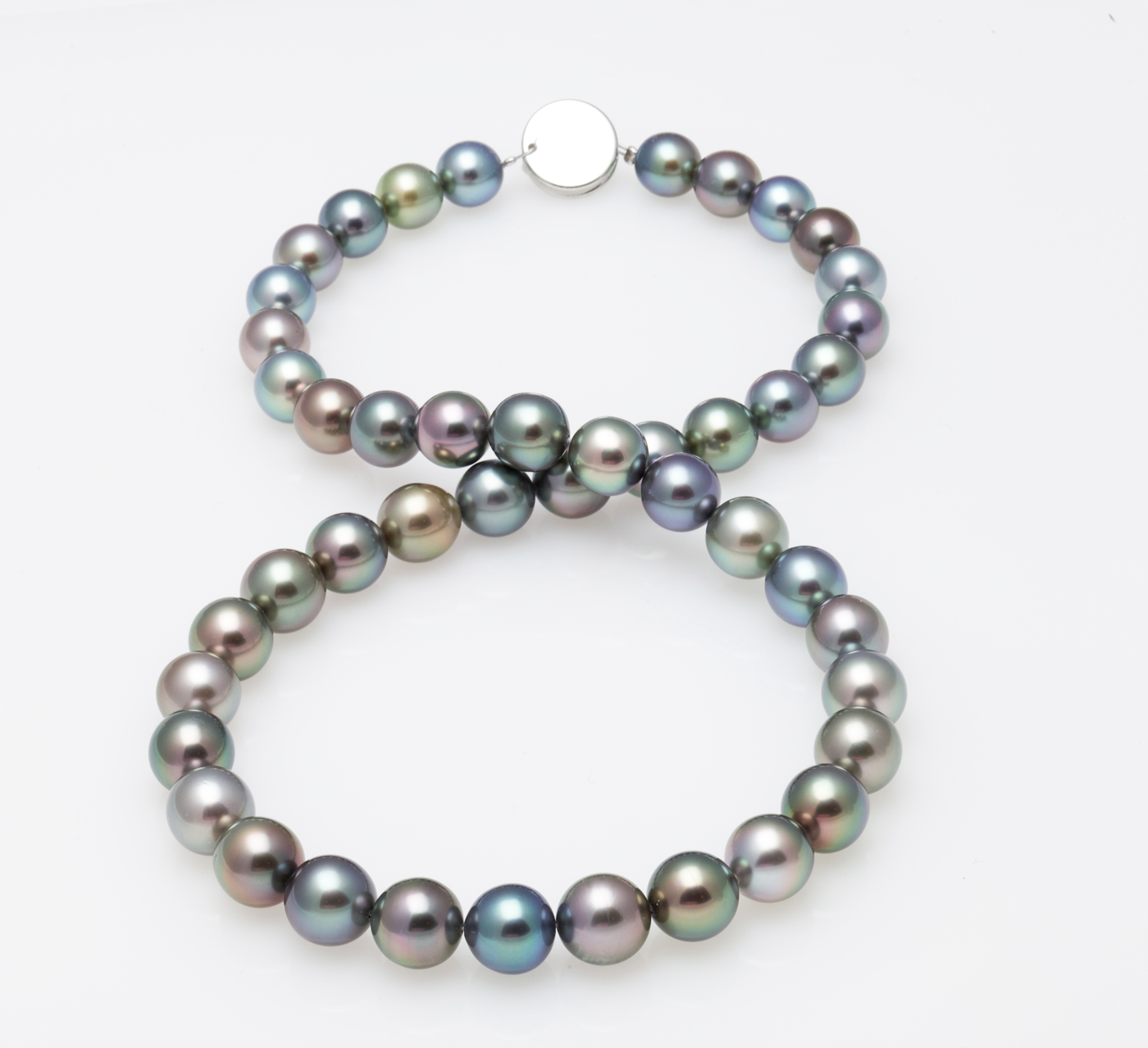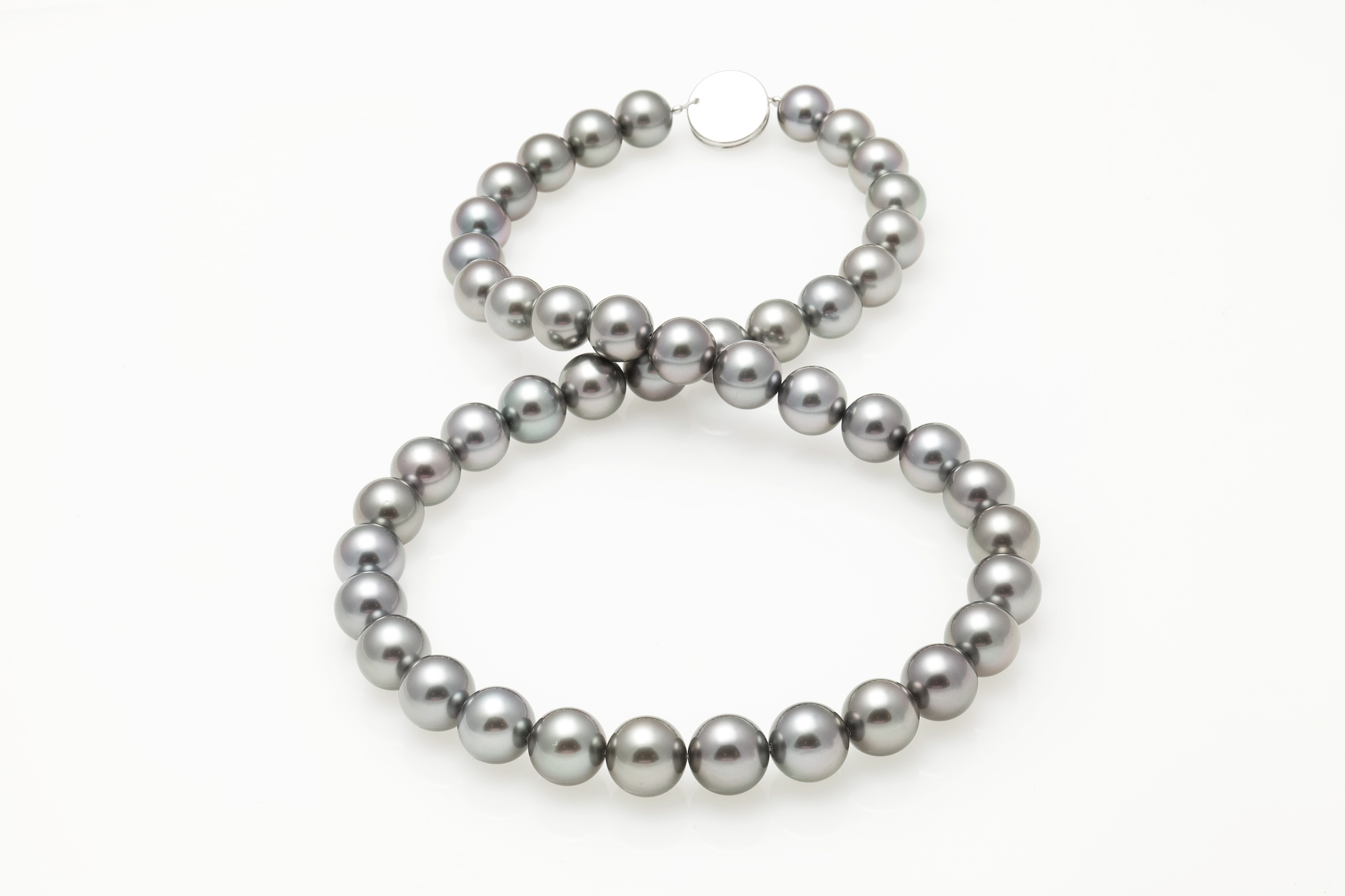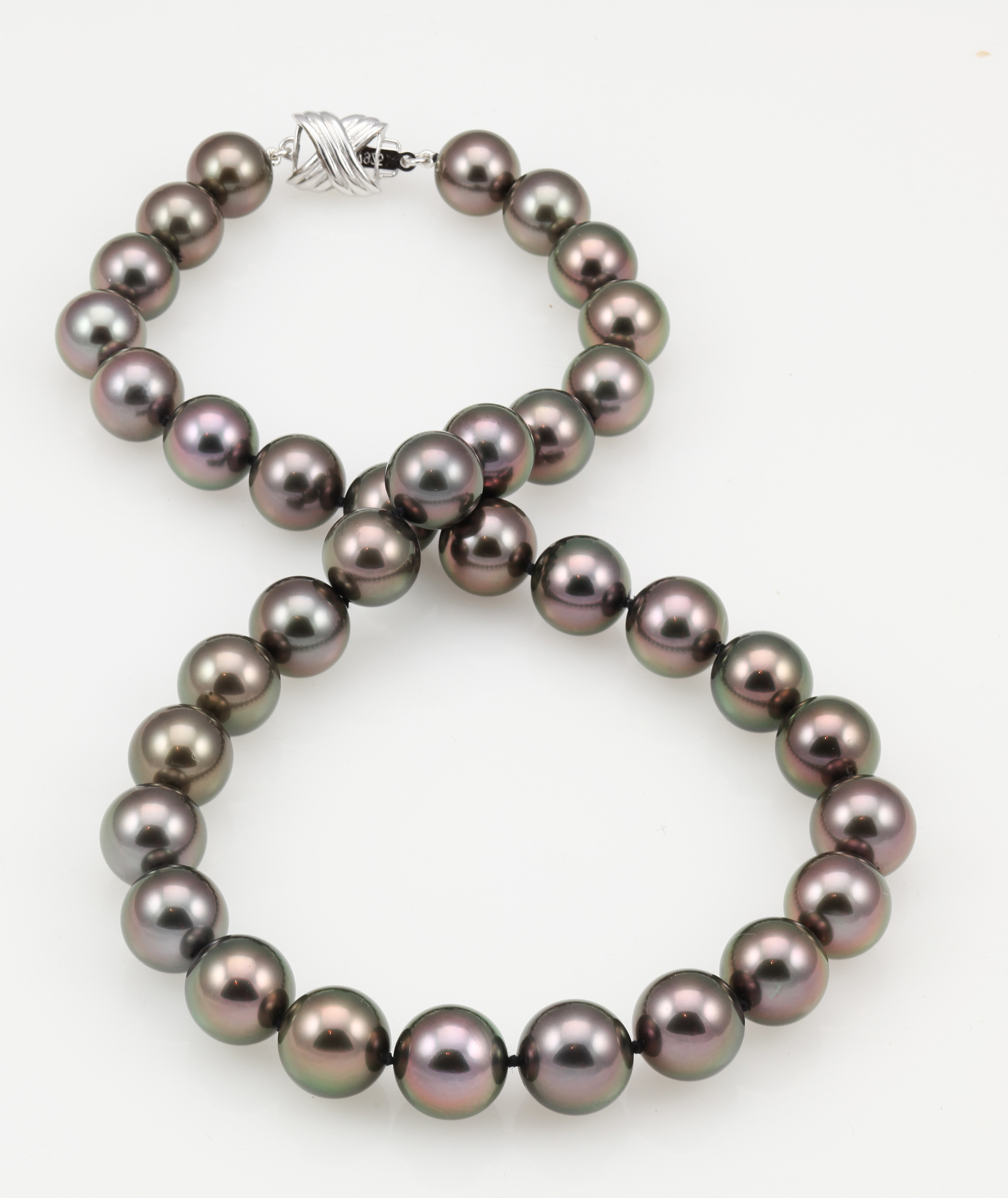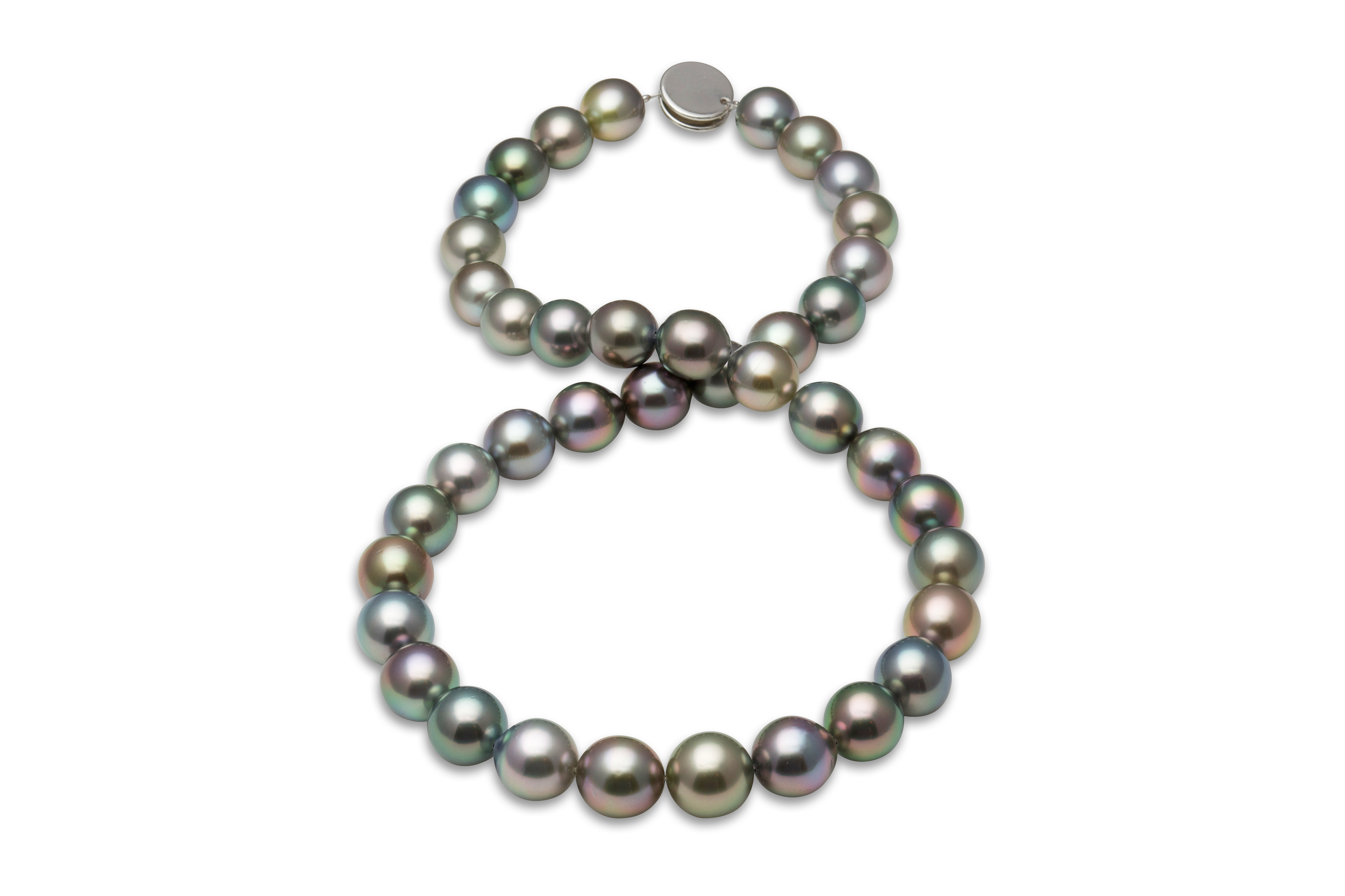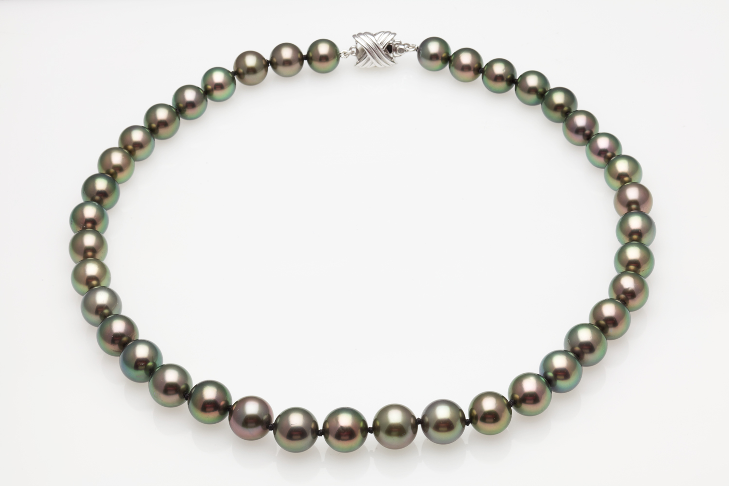 10x12mm Black Tahitian Pearl Necklace This beautiful natural color Tahitian cultured pearl necklace was just harvested from French Polynesia. The perfectly round lustrous pearls on this necklace were expertly matched by American Pearl's GIA trained staff.