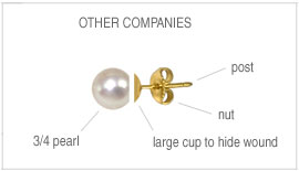 Pearl earrings are a classic staple of any woman's pearl jewelry wardrobe. Especially the simple white, round natural color Japanese Akoya cultured pearl earring featured in this section. We proudly offer you the finest quality pearls available in the marketplace. The most important factor is selecting pearl earrings is choosing two pearls that are what we call in the industry "half drilled." Half drilled pearls are perfect fully formed pearl spheres that are drilled half way to accommodate a pearl setting of your choice. It is important to start with half drilled pearls (those perfect fully formed spheres) as other pearls such as three-quarter-cut pearls that previously had a tail or irregularity that was cut off can discolor over time. Three-quarter-cut pearls are less valuable that perfectly round pearls. Some venders sell three-quarter-cut pearls and apply a large rounded cup post shown in the image above to hide the cut in the pearl and complete the round shape of the pearl by adjoining the cup post to the pearl earring. The problem with this technique is, although one cannot tell the pearls are not round, they are sure to discolor over time as dirt and other substances can penetrate the area in between the open cut of the pearl and the cup post and eventually cause the pearl to change in color over time.