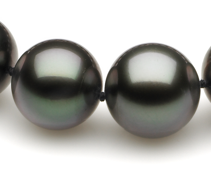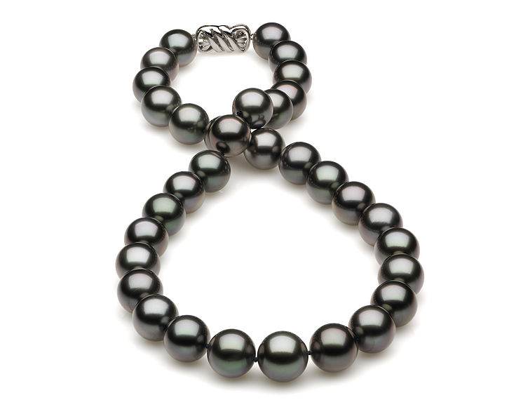 | stock number: | APT-3 | Dark Black Green Tahitian Pearl Necklace This beautiful natural color black Tahitian cultured pearl necklace was just harvested from French Polynesia. The perfectly round lustrous pearls on this necklace were expertly matched by American Pearl's GIA trained staff. |