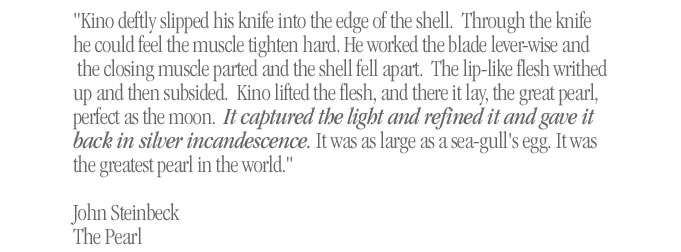 The Pearl, a novella by Nobel Prize winning author John Steinbeck tells the tale of Kino, a Mexican man who finds a magnificent pearl during a dive which could mean the promise of a better life for he and his impoverished family. The allure and beauty of a pearl can best be described by the great writer Steinbeck himself: